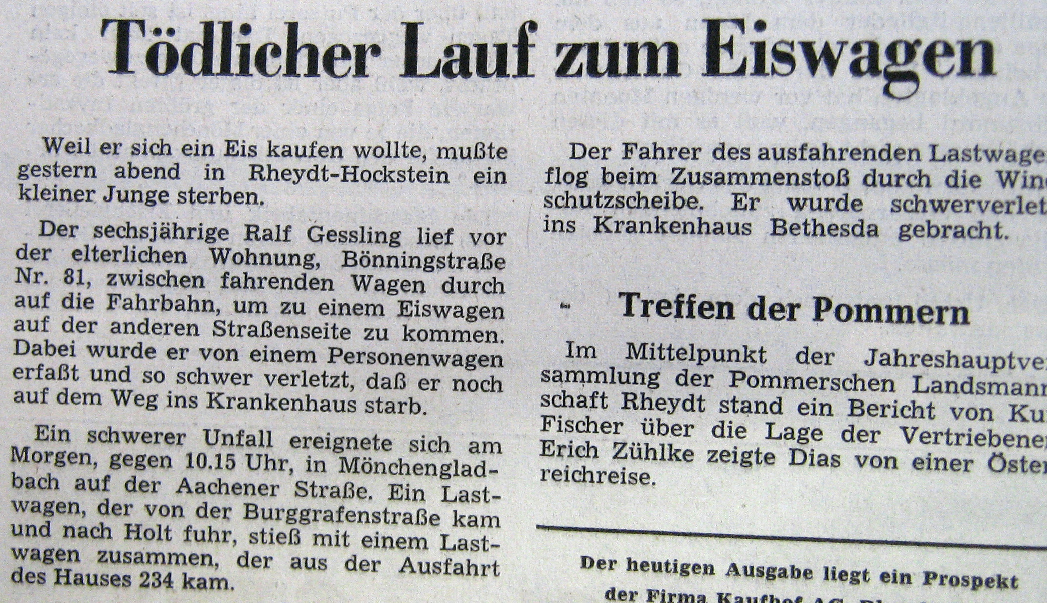 Der Unfall ist am Nachmittag des 12.04.1973 geschehen. Ralf wohnte mit seiner Familie in Mönchengladbach-Rheydt-Hockstein auf der Böningstr. Es war ein eher kalter Apriltag, aber dennoch wollte er ein Eis haben, als er den Eiswagen bimmeln hörte.
