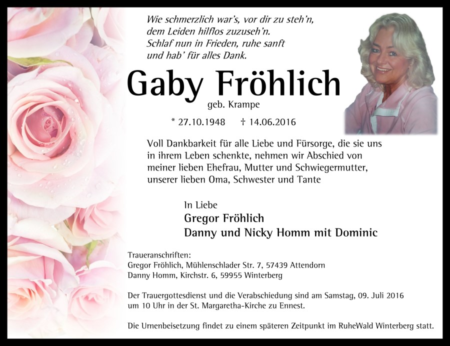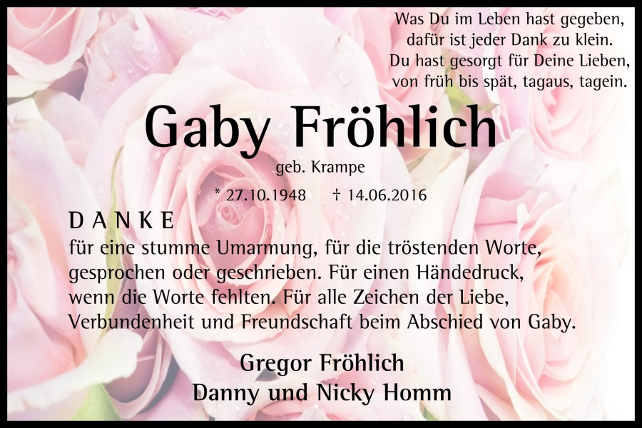 67 Jahre Gaby Fröhlich (geb. Krampe)27.10.1948 - 14.06.2016 [8.563 Besucher]